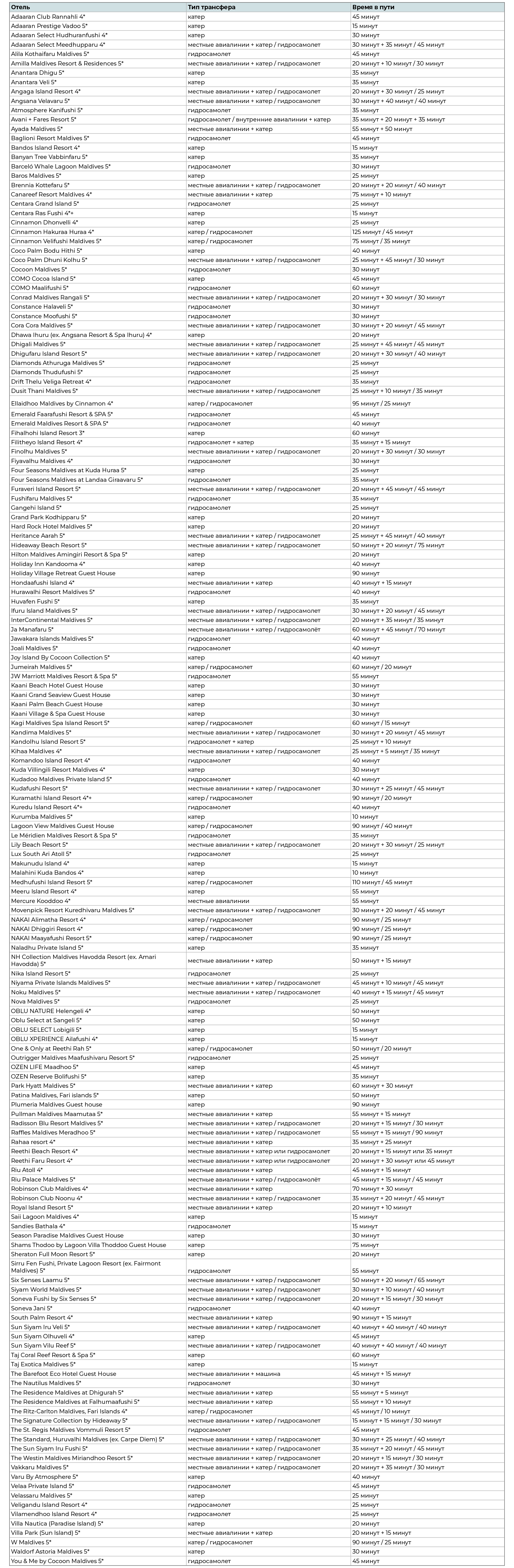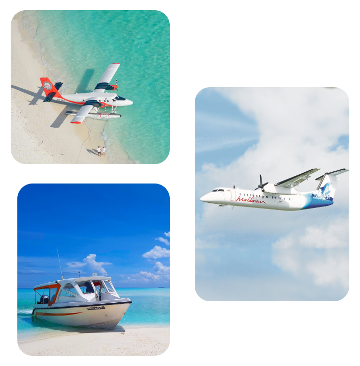 Внутренним рейсом + скоростным катером – местные авиалинии в комбинации с катером, доставят туристов с 6:00-22:00. Позволяют добраться до самых отдаленных островов. Самолёты внутренних авиалиний совершают взлёт и посадку в аэропортах местных островов. В местном аэропорту туристов встречает представитель отеля и организует дальнейший переезд на катере. В среднем, такой трансфер занимает от 1-го до 2-х часов.